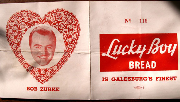 red ink, showing the Lucky Boy Bread name and the phrase "Is Galesburg's